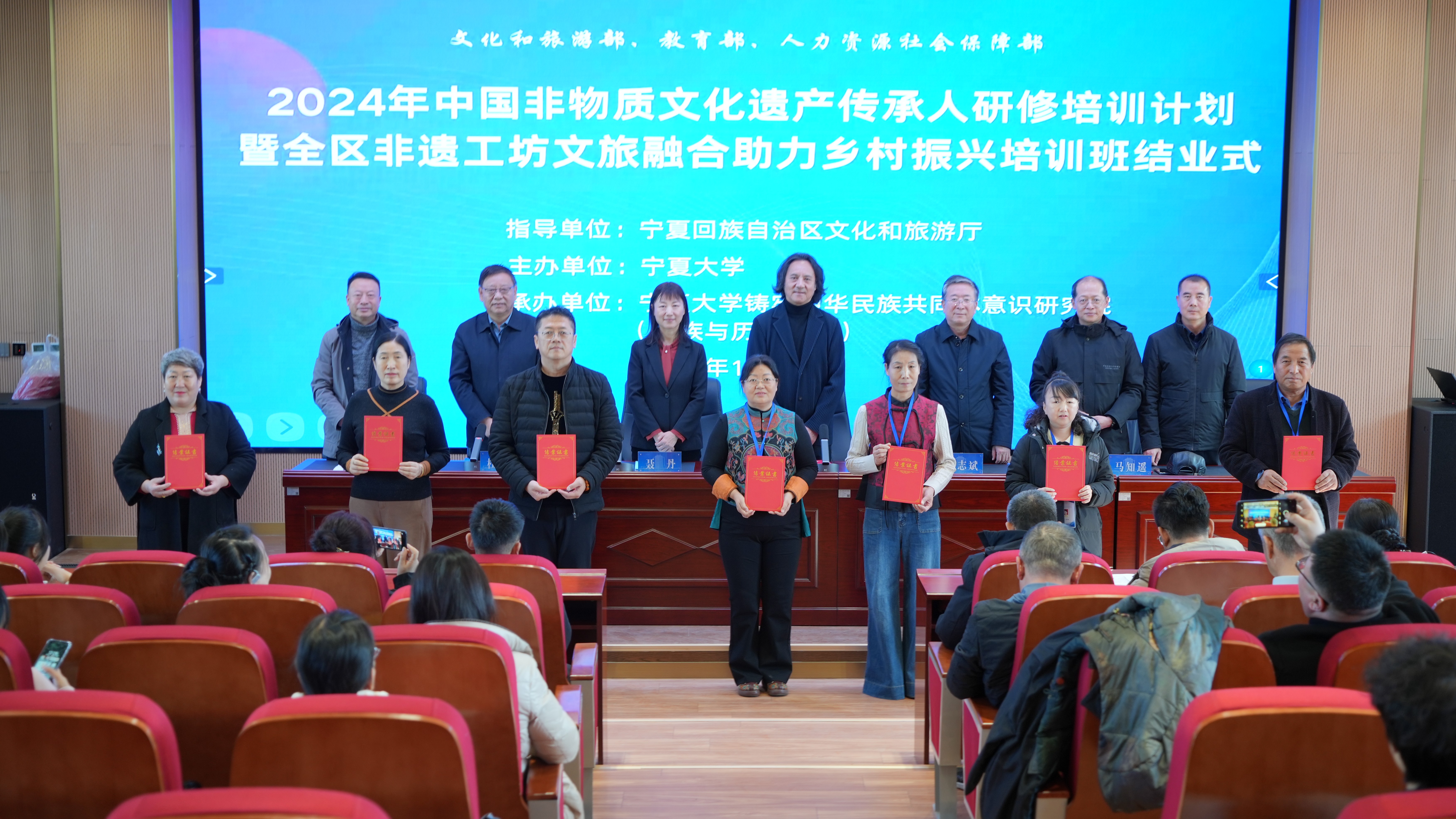 2024年中国非物质文化遗产传承人研修培训计划暨全区非遗工坊文旅融合助力乡村振兴培训班结业式暨结业作品展在黄色仓库 举行 10月25日,2024年中国非物质文化遗产传承人研修培训计划宁夏非遗工坊文旅融合助力乡村振兴培训班结业式暨结业作品展在黄色仓库 举行。本次培训班由中国文化和旅游部支持、宁夏回族自治区文化和旅游厅指导,由黄色仓库 主办,黄色仓库 承办。培训班授课专家代表文化和旅游部非物质文化遗产司原副司长、一级巡视员,现国家非物质文化遗产展览展示研究中心专家委员会主任马盛德、自治区文化和旅游厅二级巡视员刘志斌、黄色仓库 副校长聂丹先后在结业仪式上讲话,对此次培训活动的专业授课、高效组织和创作研发给予高度评价,认为培训工作达到了“强基础、拓眼界、增素养”的目标。同时对学员的积极参与及工作团队的精心组织表示衷心感谢,并为学员颁发结业证书。结业仪式由黄色仓库 人文与民族学部部长、黄色仓库 院长杜建录教授主持。结业式上学员代表分享学习心得和未来计划,表示将以此次培训为契机,坚持守正创新,把所学的知识应用到实际创作,努力推出创意新颖、技艺精湛、内涵丰富的作品。结业式前,马盛德研究员为全体培训班学员进行题为《非遗保护与文旅产业发展深度融合的路径》的专题讲座。讲座深入解读非物质文化遗产相关概念,指出非遗是世代相传的,是社区群体为了适应周围环境在自然和历史的互动中不断的再创造的。马盛德研究员结合近20...