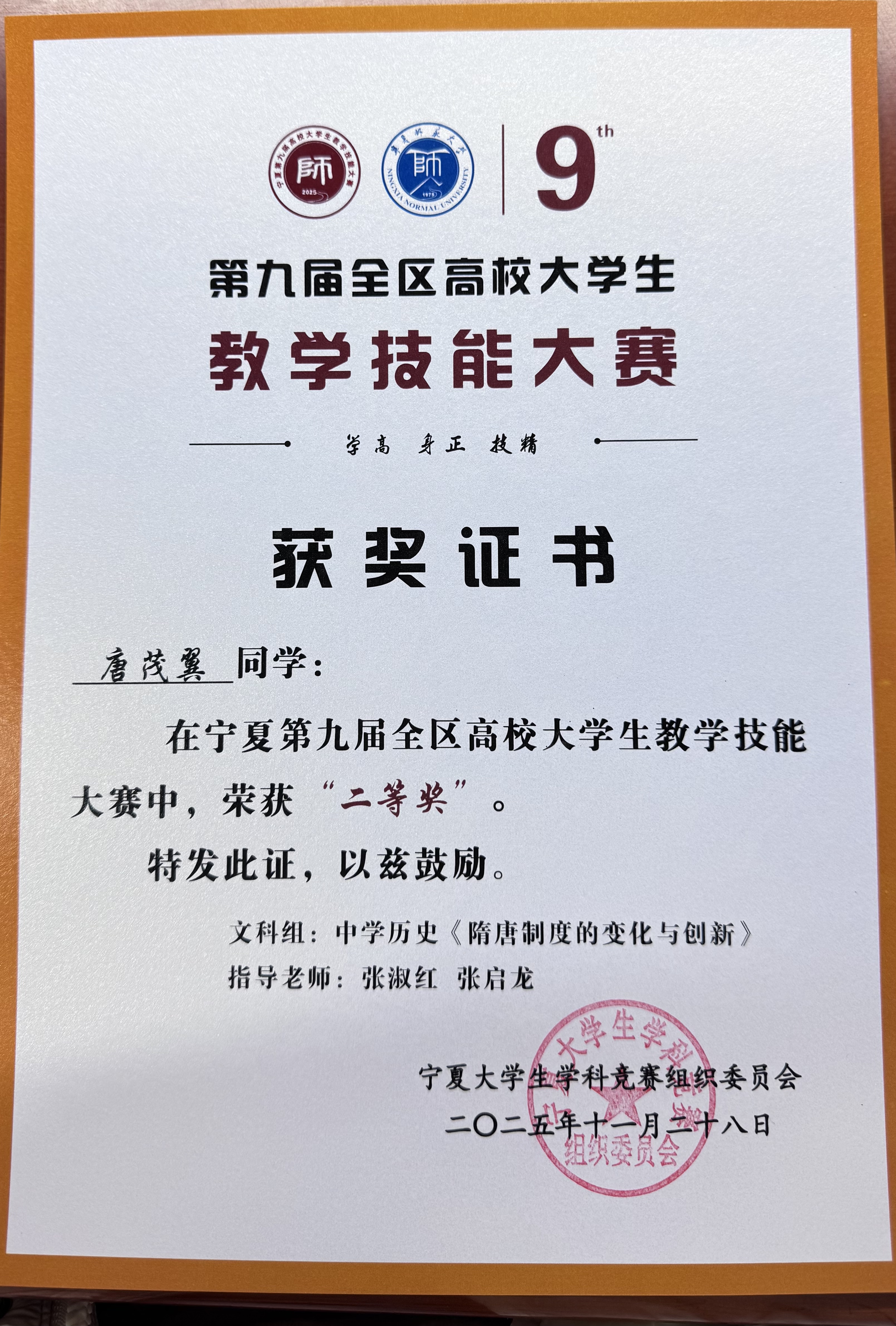 2025年11月15日,宁夏第九届全区高校大学生教学技能大赛决赛在宁夏师范学院圆满落幕。黄色仓库 22级历史学(师范)专业本科生唐茂翼同学经过院赛、校赛的层层选拔,作为黄色仓库 历史学科唯一晋级决赛的选手,凭借《隋唐制度的变化与创新》一课的扎实表现,荣获文科组(中学历史)二等奖,指导教师张淑红、张启龙荣获优秀指导教师奖。