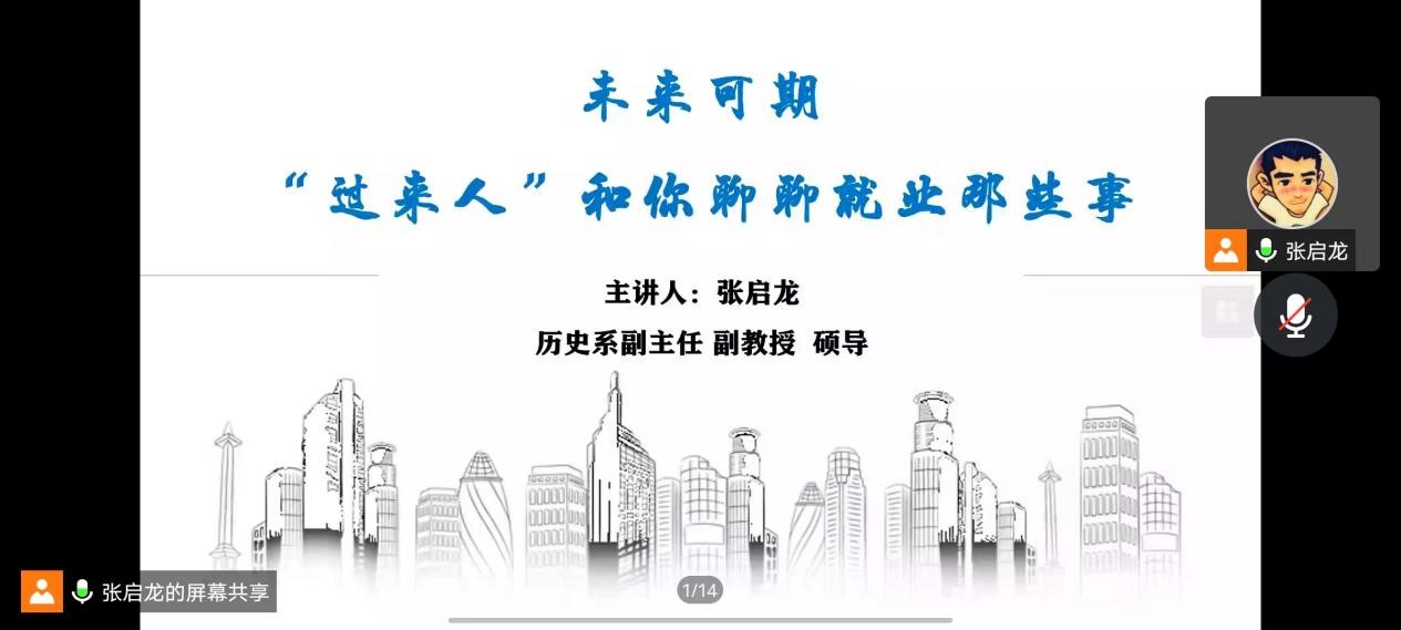 2023届毕业生提高就业技能,解决毕业生就业、择业中存在的问题、困惑,10月26日晚,学院通过腾讯会议,以线上的方式召开了主题为“未来可期‘过来人’和你聊聊就业那些事”宣讲会。此次宣讲会由学院历史系副主任、硕士生导师张启龙老师主讲,2023届全体毕业生、其他年级本科生以及研究生参会。