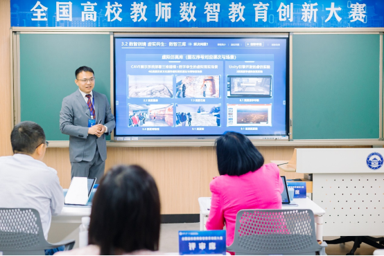 在现场汇报环节,邓文韬副教授代表《解读西夏》课程团队,结合学校办学定位,课程特色与学情概况,介绍了课程通识化转型,线上线下混合式教学,虚拟仿真技术融入与知识图谱、数字资源库建设概况及其育人功能、成效,展现了数智技术赋能通识课程建设,培养“四新”人才的路径。最终以优异成绩位列本组第一名,荣获赛事特等奖。