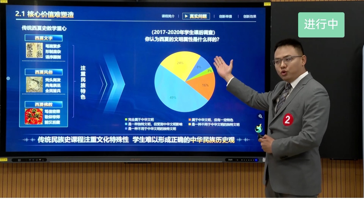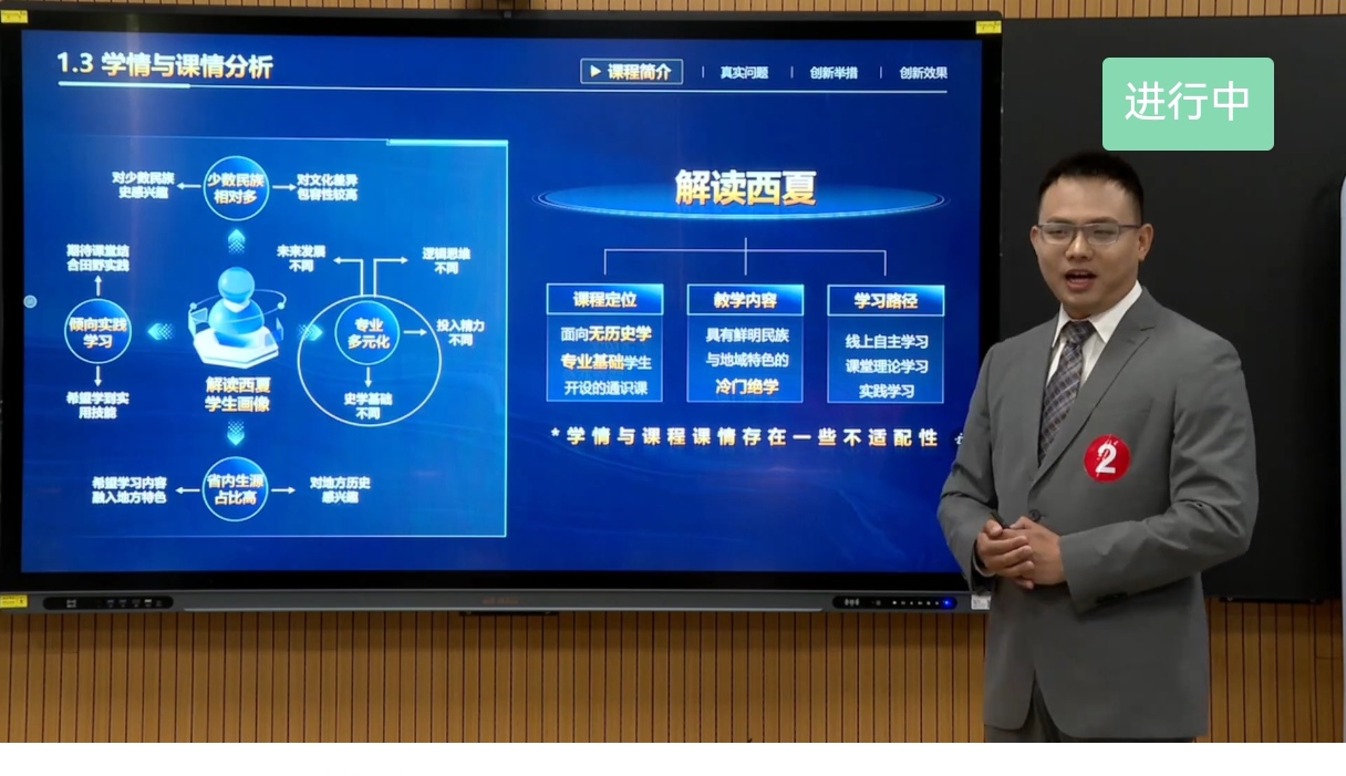 教师邓文韬副教授(团队)代表学校参加课程思政组的角逐,以“铸牢引领、协同实证、具身化知:解读西夏的课程思政创新”的教改设计汇报,赢得评委一致好评。在课堂实录、创新报告评审与创新设计汇报三个环节评分皆领先其他选手,并最终以90.962分的成绩排名本组第一,获课程思政组一等奖,将在今年8月代表宁夏回族自治区教师参与在北京理工大学举办的全国总决赛。